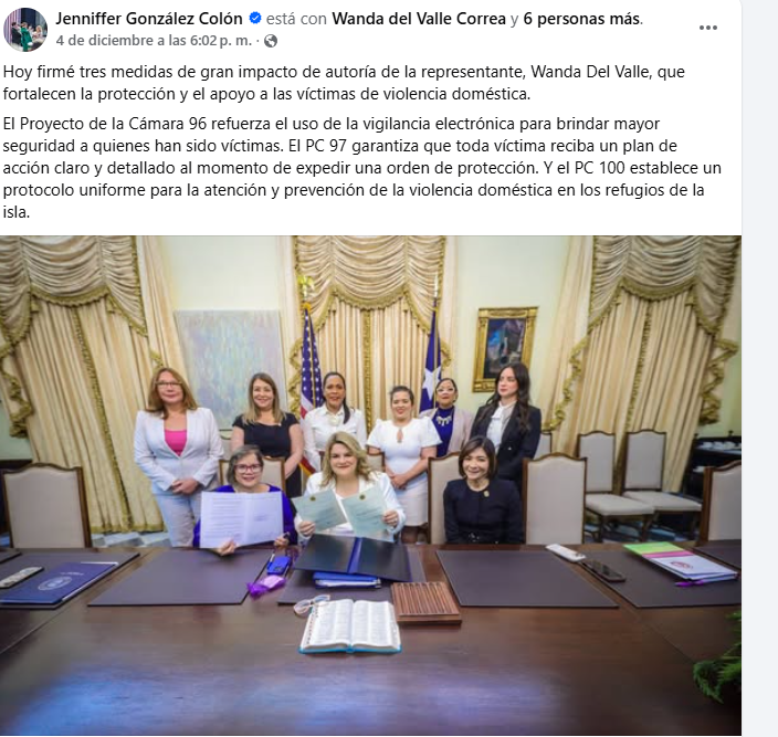 El 4 de diciembre, las cuentas oficiales de la Gobernadora Jenniffer González, el Departamento de Justicia y la Oficina de la Procuradora de las Mujeres (la OPM anunciaron con entusiasmo la aprobación de tres nuevas leyes vinculadas, según su presentación pública, con la protección de las mujeres ante la violencia. Sin embargo, al examinar esos anuncios quedó claro que la narrativa pública no coincidía con el contenido real de todas las medidas. En particular, las tres cuentas oficiales presentaron la ahora Ley 139-2025 como una intervención dirigida a la violencia doméstica en refugios, cuando la ley aprobada no utiliza ese lenguaje ni atiende el problema desde esa óptica.