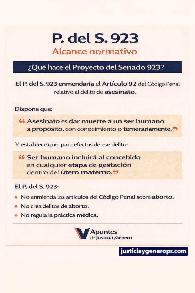 Sin dudas preocupa que este tipo de proyectos se vayan construyendo de manera acumulativa, utilizando reformas previas como zapata para nuevas regulaciones, sin un análisis integral de sus efectos. Aunque el P. del S. 923 no criminaliza ni regula el aborto, sí contribuye a la configuración paulatina de un marco jurídico que hace más vulnerables a las mujeres que puedan necesitar acceder a servicios de aborto en el futuro.